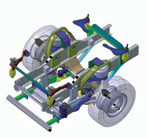 Multi-body simulations were performed during the design of the system’s kinematics. The main focus here was on improving various aspects of driving safety and cost of ownership, such as a reduction of tyre wear. It was decided to separate the suspension and damping elements in order to make more effective use of space and improve the load distribution. Because such axles generally have ball joint connections to the wheel knuckle, the number of components can be reduced. A particular design aim in this system is to keep the control arms as short as possible in order to provide more room for the drivetrain and reduce vehicle weight.