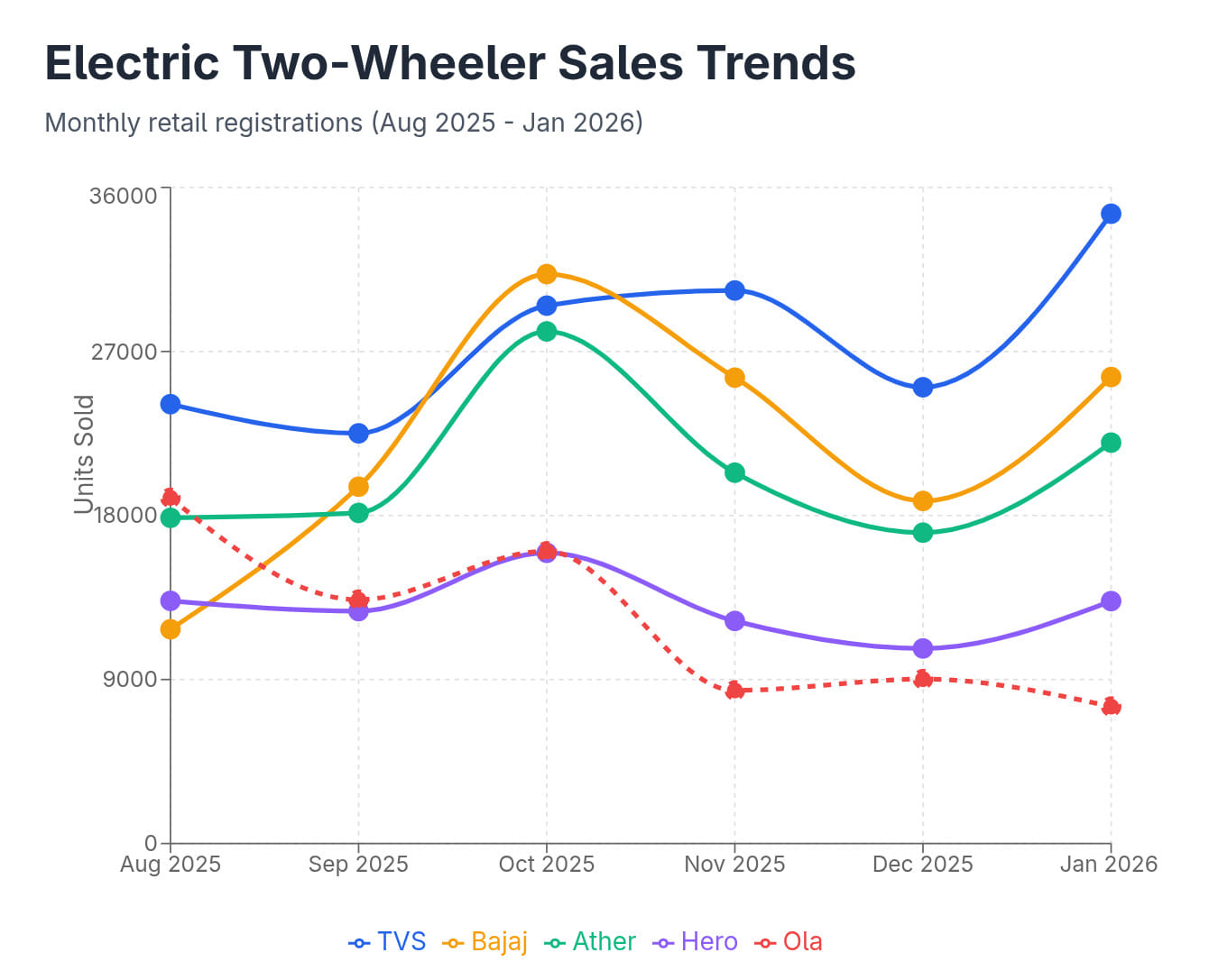 But the competitive story extends beyond TVS’s ascent. Ather Energy and Hero MotoCorp are posting explosive growth—68% and 718% year-on-year respectively—driven by product strategies that have unlocked new customer segments. Meanwhile, Ola Electric, which once commanded over a third of the market, has collapsed to just 7,516 units in January, down 69% year-on-year, falling behind even Hero into fifth place.