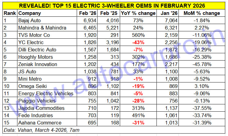 In January 2026, the Pune-based Bajaj Auto, which is the ICE 3W domestic and export market leader, went ahead of Mahindra for the first time since it diversified into the e-3W market in June 2023. While Bajaj sold 7,064 units (passenger and cargo models combined) compared to MLMM’s 6,321 units in January (revised Vahan stats as of March 4, 2026), February has seen Bajaj Auto repeat the act. Last month saw Bajaj deliver 6,934 -3Ws (up 73% YoY) to its customers, which makes for a 469-unit lead over MLMM’s 6,465 units (up 24% YoY).