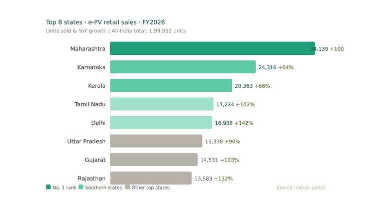 In FY2026, as per the Vahan portal, a total of 34,139 electric passenger vehicles (e-PVs) were sold in Maharashtra, up 100% YoY (FY2025: 17,092 units), which gives it a 17% share of the record sales of 199,952 e-PVs in India and improves upon the 15% share the state had in FY2025.
