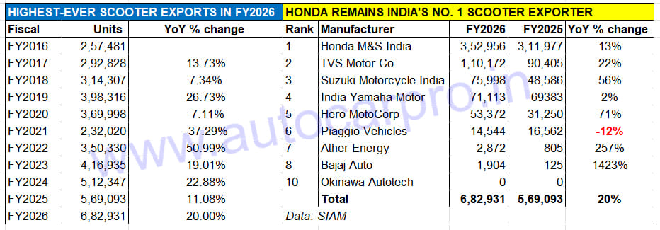 The Indian scooter industry has had a standout fiscal in FY2026. Not only did it achieve best-ever domestic market wholesales of 8.11 million units (81,17,945 units, up 18.5% YoY) but FY2026 was also the best-ever fiscal for export of made-in-India scooters.