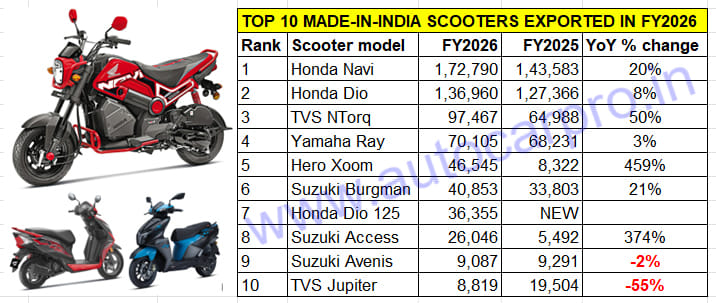 Honda with 346,105 units, comprising the Navi and Dio, had a 52% share of scooter exports in FY2026. The TVS NTorq, Hero Xoom and Suzuki Access also saw strong demand come their way.