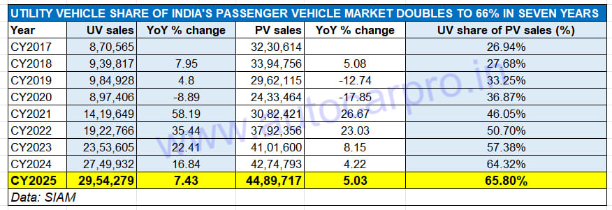 Utility vehicle sales rose to a new high of 2.95 million units in CY2025, with their share of the passenger vehicle market doubling to 66% from 33% in CY2019.