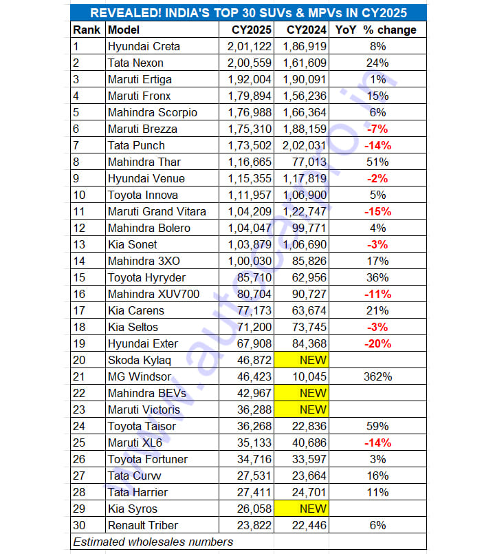 India’s Top 30 SUVs, MPVs In CY2025 – Hyundai Creta Pips Tata Nexon To Top Spot