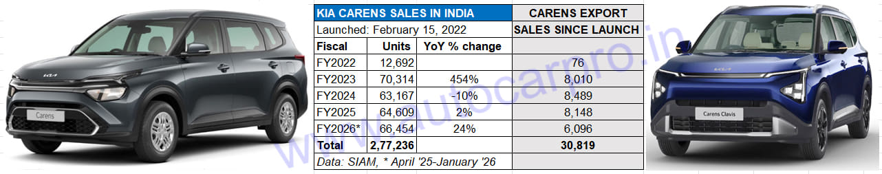 In FY2026’s first 10 months, the Carens (66,454 units) is Kia India’s second best-selling model after the Sonet (93,380 units) and is ahead of the Seltos (62,398 units). It is set to clock record sales of 75,000 units in FY2026.