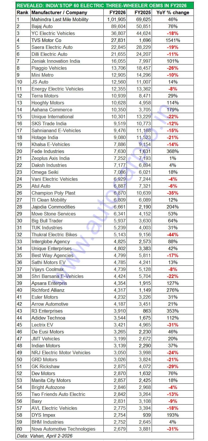 Demand for electric 3-wheelers rose 19% to a record 830,819 units in FY2026. While market leader Mahindra Last Mile Mobility sold 101,905 units, Bajaj Auto and TVS Motor also secured their highest sales as legacy OEMs stamped their authority. We reveal India’s Top 60 e-3W OEMs.