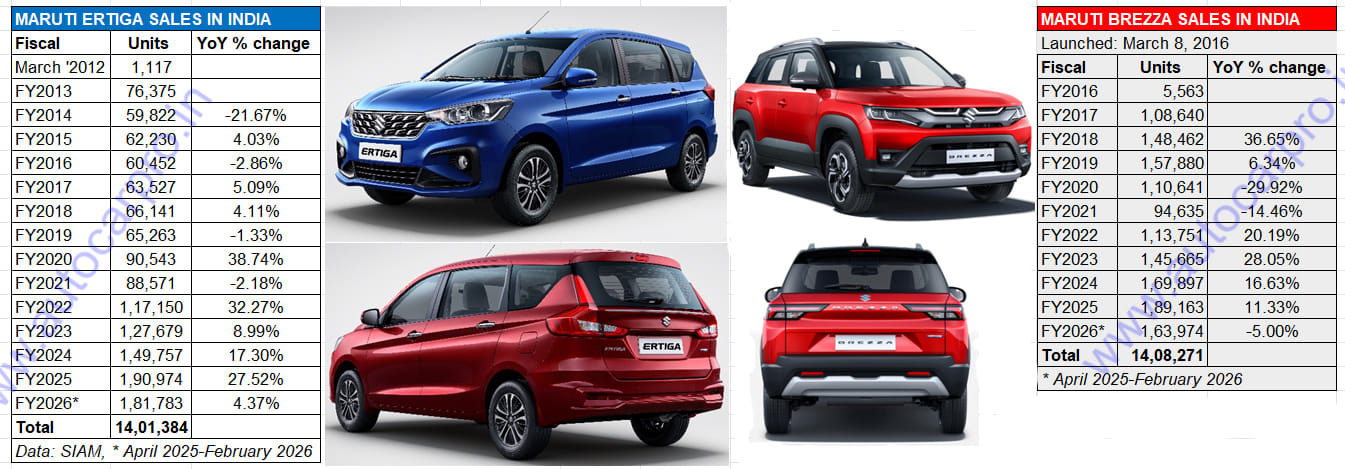 While the Maruti Ertiga, launched on April 16, 2012, has clocked 14,01,384 units till end-February 2026, the Maruti Brezza, which kickstarted the compact SUV market on March 8, 2016, has registered total sales of 14,08,271 units.