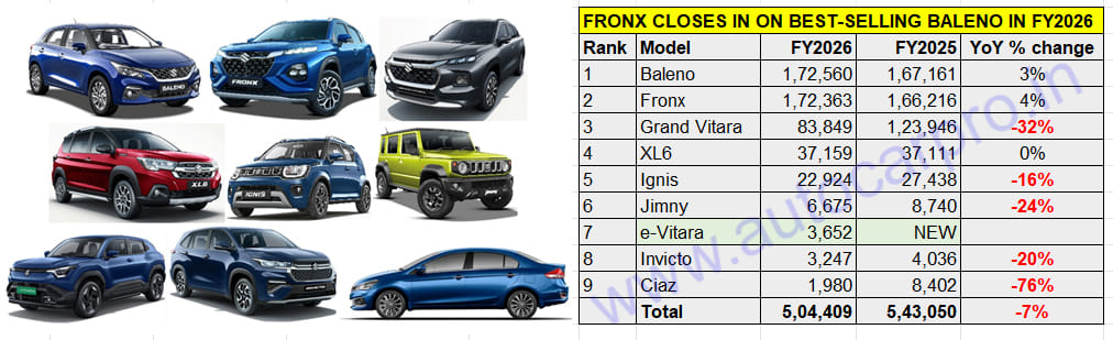 Premium Nexa channel sells 504,409 passenger vehicles in FY2026, down 7% YoY due to a sales decline for five models including the Grand Vitara. While the Baleno held onto its No. 1 rank with 172,560 units, the Fronx compact SUV was just 197 units behind the hatchback.