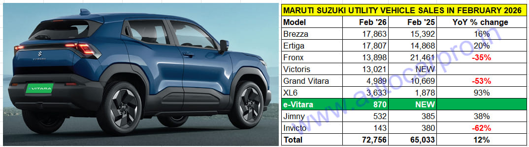 As Maruti Suzuki’s UV wholesales data table for February 2026 (below) reveals, the Brezza compact SUV topped the company’s dispatches with 17,863 units. The other five UVs ahead of the e-Vitara are the Ertiga (17,807 units), Fronx (13,898 units), Victoris (13,021 units), Grand Vitara (4,989 units) and XL6 (3,633 units).