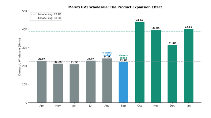 Among the most striking numbers in the October–January data is Maruti Suzuki’s UV1 segment performance. The company’s wholesale volumes in this segment jumped from an average of 22,415 units per month (April through September) to 38,846 units (October through January) — a 73 per cent increase. At first glance, this looks like it could be a GST-related story. It is not.