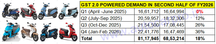 While combined Q1-Q2 FY2026 sales at 3.72 million units rose 6% over H1 FY2025, GST 2.0-driven price cuts saw the H2 FY2026 (Q3 and Q4) register 31% YoY growth with 4.39 million scooters.