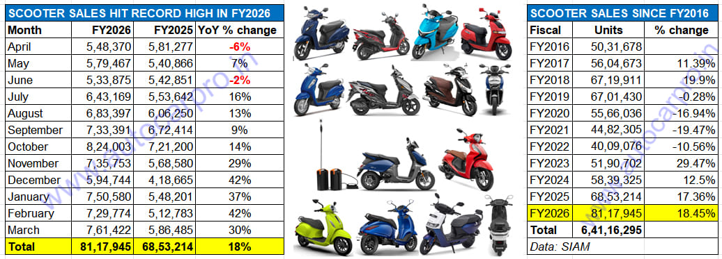 If the overall Indian two-wheeler industry, which comprises motorcycles, scooters and mopeds, achieved record wholesales of 21.70 million units with strong 11% YoY growth in FY2026, then it’s thanks to the robust growth displayed by the scooter segment. In FY2026, nine scooter manufacturers sold a record 8.1 million units (81,17,945 units, up 18.5% YoY) to beat the previous best of 6.85 million units in FY2025 and set a new benchmark (see 11-year data table below).