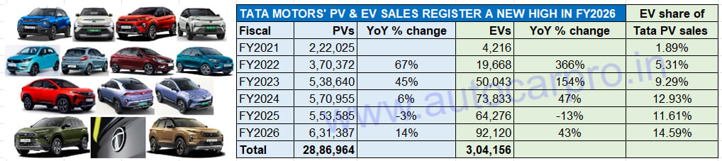 The 92,120 EVs sold in FY2026 constitute strong 43% YoY growth and a highest-yet 14.59% share of Tata Motors’ record passenger vehicle wholesales (factory dispatches) of 631,387 units.