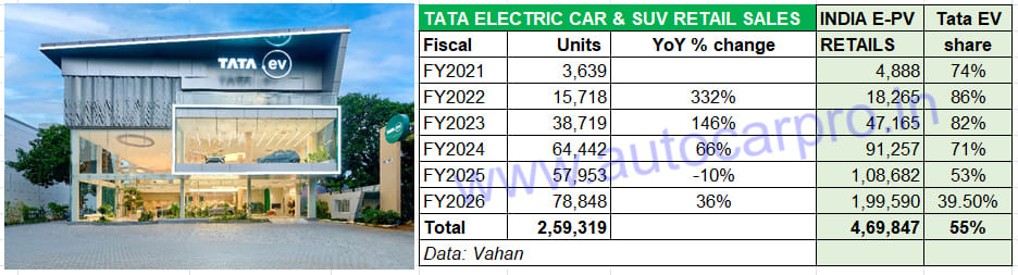 At 78,848 units, Tata EV retails hit a new high in FY2026 albeit market share (40%) has fallen from 71% in FY2024 with new competition from JSW MG Motor and Mahindra (combined 48% share).