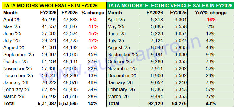Tata Motors closed FY2026 with record passenger vehicle wholesales of 631,387 units including its highest-ever EV dispatches of 92,120 units for the fiscal year and 9,494 units in March, which take its cumulative electric car and SUV wholesales to 304,156 units since FY2021.