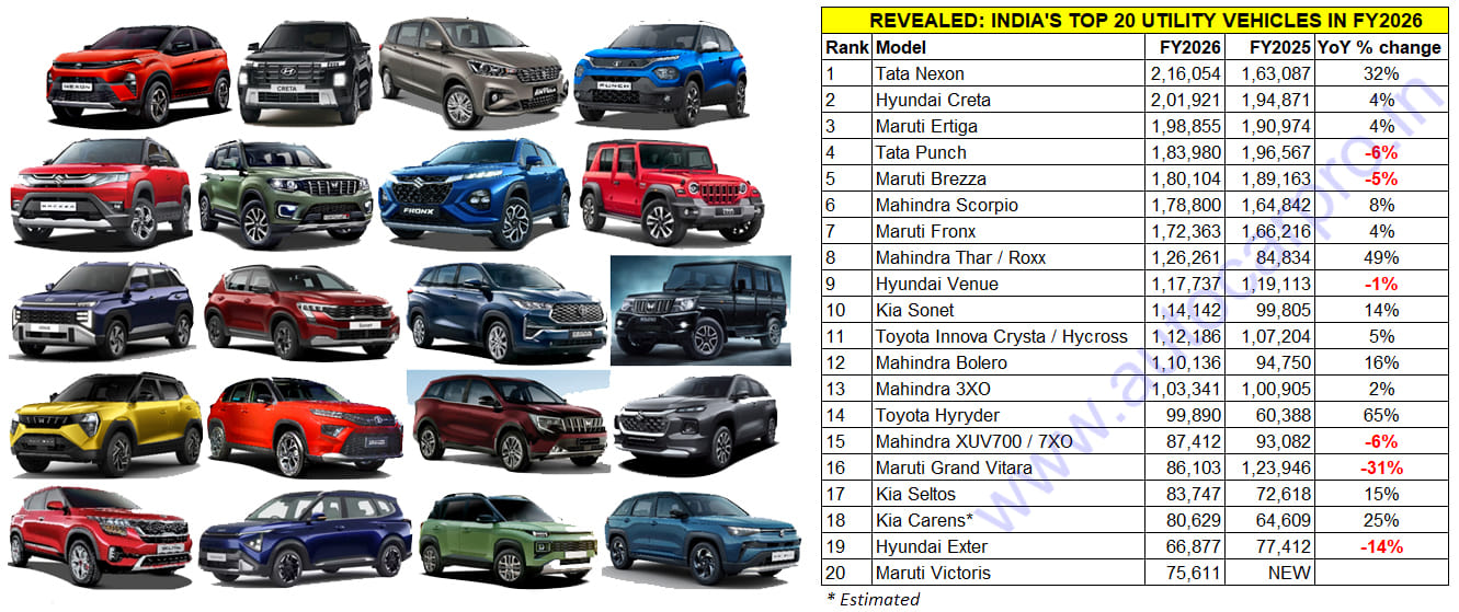 The Maruti Victoris midsize SUV, launched in September 2025, wraps up the Top 20 UV list with 75,611 units. Maruti Suzuki’s latest midsize SUV, which is sold through its Arena dealerships as the company’s flagship model, had a 10% of the record 760,987 UVs the PV market leader sold in FY2026.