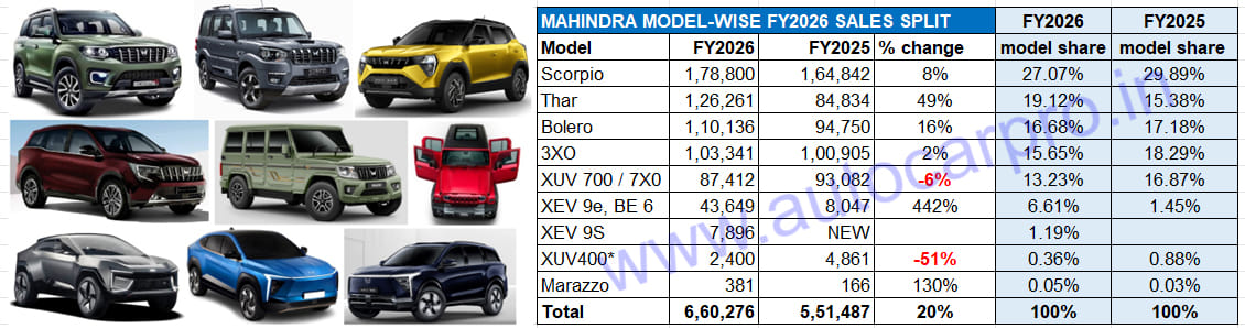The Bolero brand, which comprises the Bolero and Bolero Neo Plus, had a 17% model-wise share with 110,136 units (up 16% YoY) in FY2026, similar to FY2025 and retains its No. 3 ranking. The 3XO compact SUV (103,341 units, up 2% YoY), which was ranked No. 2 in FY2025 has dropped two positions to No. 4 in the M&M SUV stable and has a 16% share, down on the 18% in FY2025.