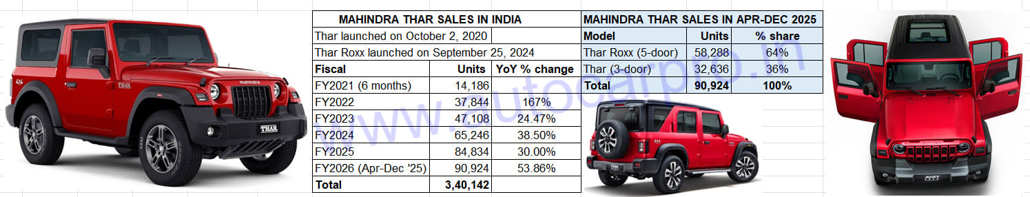 As a result of the two Thars’ strong performance, their share of M&M’s SUV sales has also risen substantially. In the first three quarters of FY2026, the two Thars with combined sales of 90,924 units have a 19% share of the total 476,476 Mahindra SUVs sold as compared to 15% in April-December 2024 (59,093 Thars from 402,360 Mahindra SUVs).