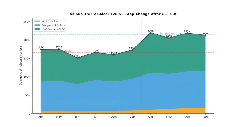 The Mini segment’s doubling, as dramatic as it is, represents a relatively small volume in absolute terms. The more consequential question is whether the GST cut had a measurable impact across the broader universe of sub-4m vehicles, which collectively form the majority of India’s passenger vehicle market. The data indicates that it did.