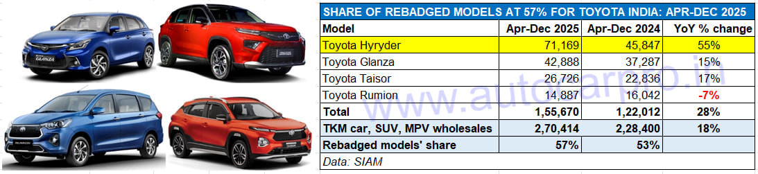 As in FY2025, when it was TKM’s best-selling Maruti-rebadged model, the Hyryder (71,169 units) is ahead of the three other badge-engineered models in India that sport the Toyota logo: the Maruti Baleno-based Glanza hatchback (42,888 units), the Fronx-based Urban Cruiser Taisor (26,726 units) and the Ertiga-based Rumion MPV (14,887 units). In October 2025, with best-ever monthly wholesales of 11,555 units, the Hyryder had dethroned the Innova MPV, Toyota India’s longstanding best-seller, and accounted for 34% of the company’s record monthly dispatches of 33,809 utility vehicles.