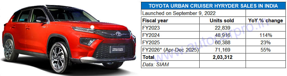 The Toyota Urban Cruiser Hyryder has driven past the 200,000 sales milestone in the domestic market in a little over three years (40 months) after launch on September 9, 2022. That this milestone would be achieved in December was accurately forecast in Autocar Professional’s November 15 sales analysis.