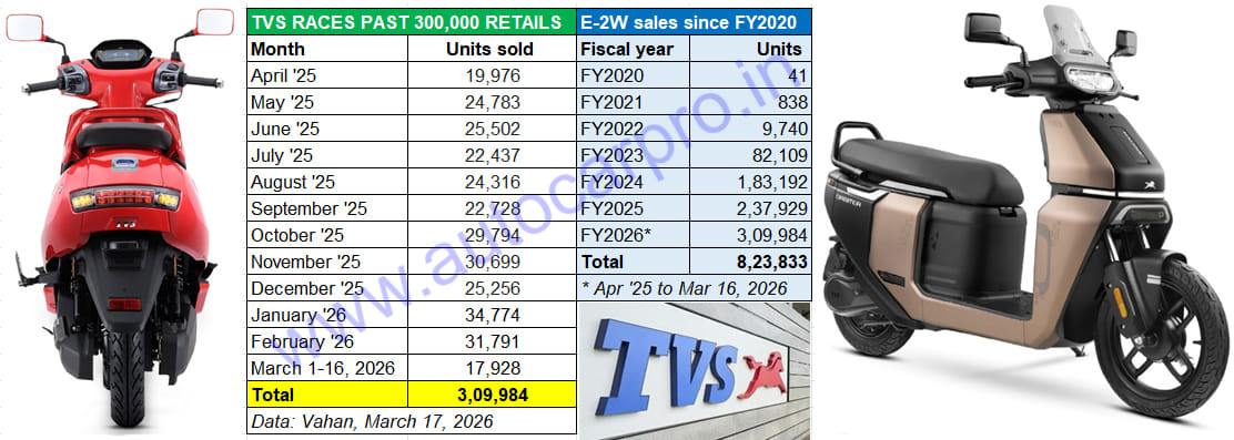 As per the latest statistics on the Vahan portal, TVS has delivered 309,984 e-scooters between April 1, 2025 and March 17. With two weeks still left in March 2026, TVS can be expected to wrap up FY2026 with record retail sales of around 327,000 units. In terms of wholesales (factory dispatches), TVS has clocked 328,744 units (up 33% YoY) in the first 11 months of FY2026 as per industry body SIAM.