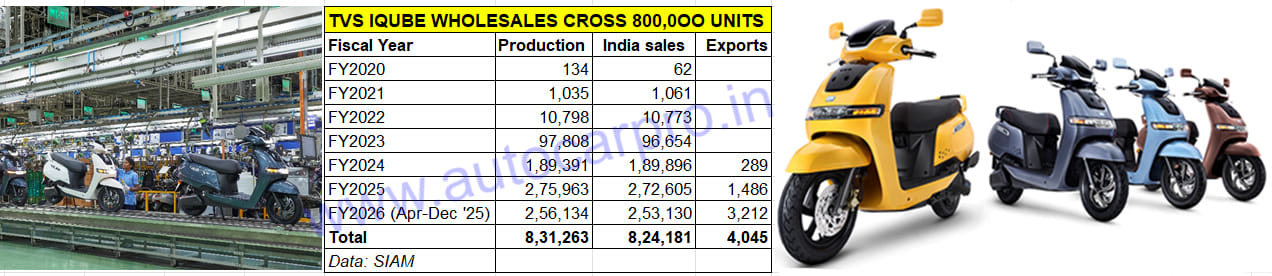 As per SIAM e-2W data statistics, total factory dispatches (wholesales) from market launch in January 2020 are 824,181 units. TVS has also exported 4,045 iQubes to overseas markets. Total iQube production from FY2020 till December 2025 is 831,263 units (see data table below).