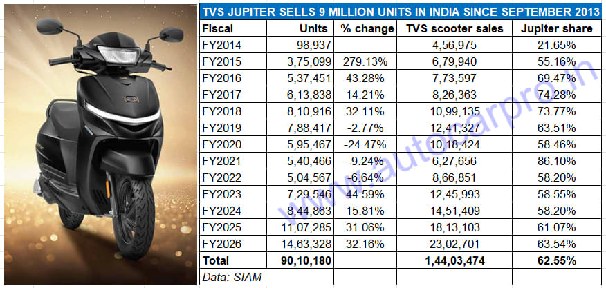 TVS Jupiter, sold in 113cc and 125cc variants, hit a new high in FY2026. The last million units were sold in just 8 months, taking cumulative sales past 90 lakh and giving it a 62% share of TVS’ 14.40 million scooter sales since FY2014.