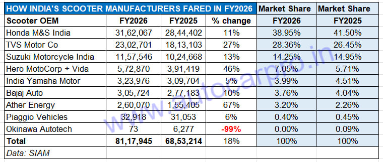 Demand for made-in-India scooters hit a new high of 682,931 units in FY2026. Honda led with a 52% share, driven by Navi ...