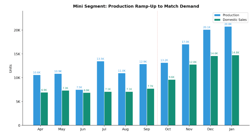 If there were any doubt about whether Maruti treats this as a temporary bump or a permanent demand shift, the production data resolves it. Mini segment production was in the 7,500–13,500 range from April to September. Starting in October, it climbed to 13,173, then 17,024 in November, 20,103 in December, and 20,754 in January.
