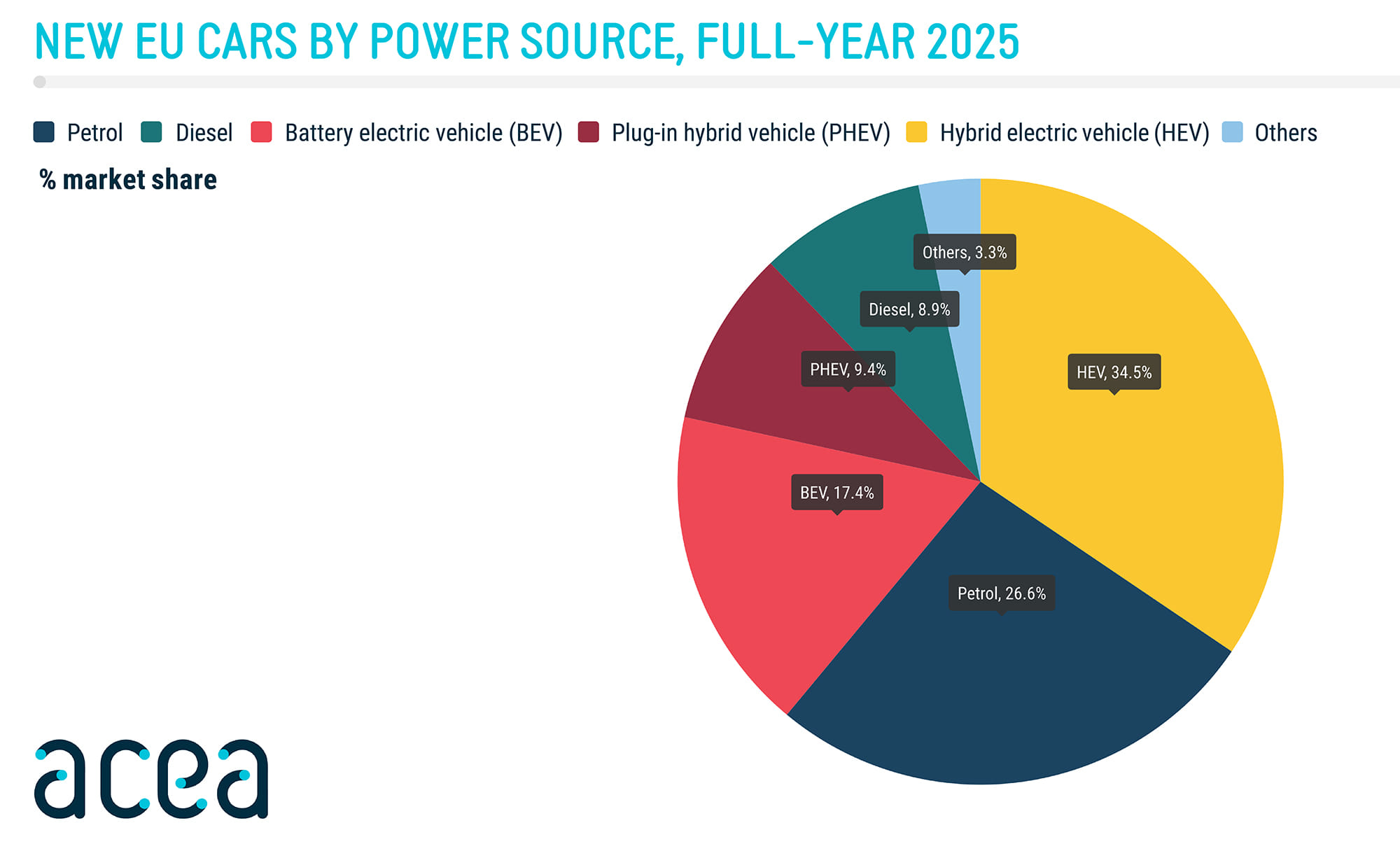 The EU’s top four battery electric car markets registered double-digit growth in a year which saw the BEV share rise to 17.4% of the 10.3 million new cars sold. While hybrid-electric cars captured 34.5% of the market to remain the preferred choice among consumers, the combined share of petrol and diesel cars fell to 35.5%, down from 45.2% in 2024.