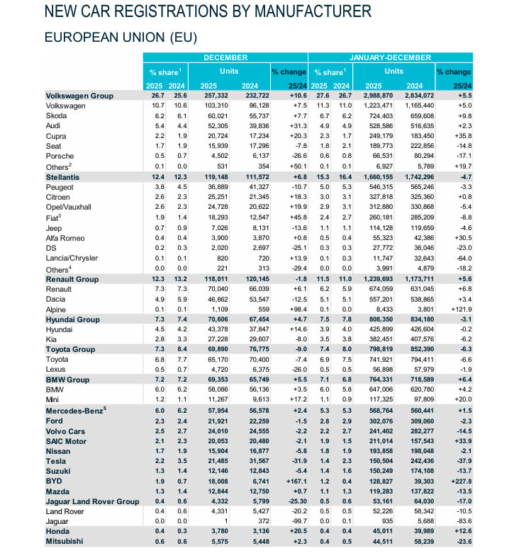 The diesel car market continued to decline, with registrations down by 24.2% and now belong the million-units mark to 960,024 units, resulting in an 8.9% share in 2025 (CY2024: 1,267,347 units). Both the top two markets saw a high rate of YoY decline: Germany (395,022 units, -18.3%) and Italy (147,277 units, -31.5%).