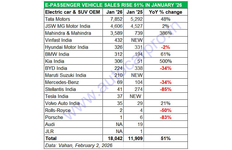 The eight electric luxury car and SUV manufacturers have together sold a total of 456 units in January 2026, up 28% YoY (January 2025: 357 units). The Vahan portal, however, has not listed sales data for Audi and JLR last month. BMW India tops the table with 312 units, which is a 61% YoY increase and gives it a commanding 68% share of this e-PV category.