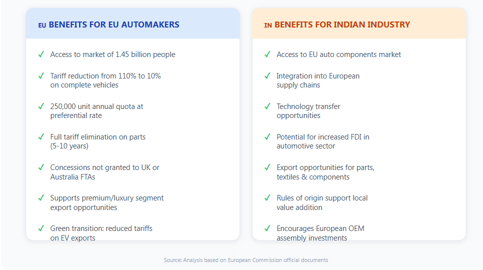 The elimination of tariffs on automotive components facilitates deeper integration between European and Indian automotive supply chains. European Tier 1 and Tier 2 suppliers can export to Indian assembly plants without tariff burdens, while Indian component manufacturers gain tariff-free access to EU markets under the agreement's reciprocal provisions.