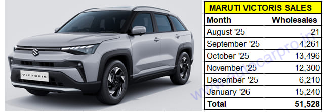In January 2026, the Victoris with 15,240 units accounted for 20% of Maruti Suzuki’s UV sales of 75,609 units. It was also the sixth best-selling SUV and the 10th highest-selling PV in India.
