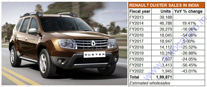 FY2014 (46,786 units) was the first-gen Renault Duster’s best fiscal year when it had a 9% share of the 525,942 utility vehicles sold in India. Decadal wholesales were a shade below 200,000 units.