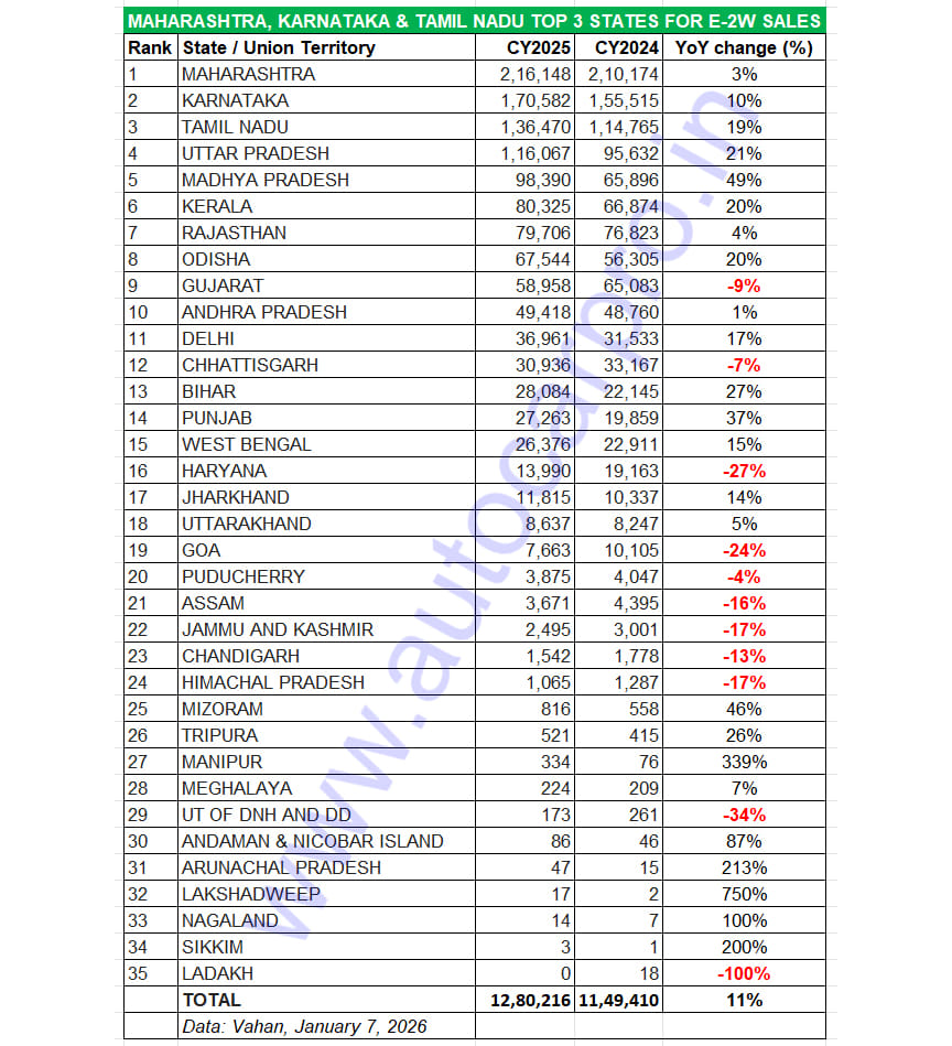 Maharashtra, Karnataka and Tamil Nadu continue to be the top three states in terms of annual sales of e-2Ws, the most affordable sub-segment of the EV industry. Of the record 12,80,216 e-2Ws sold in CY2025 (up 11% YoY), this trio accounted for 523,200 units or a 41% share.