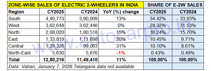 With 440,773 units and a 34% share of all-India sales, the Southern zone had the highest number of electric two-wheeler buyers in CY2025. While the Western zone saw flat sales and a drop in its market share, the North, East and Central India zones registered double-digit growth.