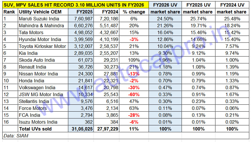The Top 6 OEMs (2.91 million units), accounted for 94% of the 3.10 million UVs in FY2026. While Maruti and Hyundai saw their UV share fall, Mahindra, Tata Motors, Toyota and Kia posted gains.