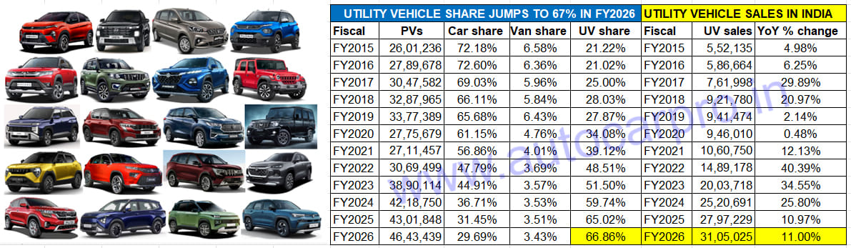 SUV and MPV sales rose to a new high of 3.10 million units in FY2026 with the UV share of the Indian passenger vehicle market nearly doubling to 67% in a span of just six years.