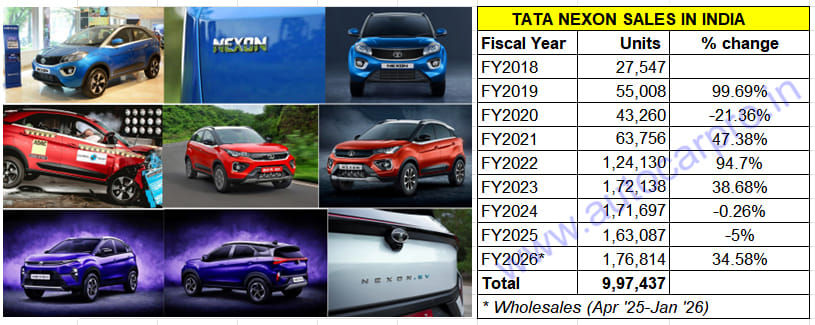 Since launch till end-January 2026, the Nexon has clocked total wholesales of 997,437 units (see data table below) including a record 23,365 units last month. The remaining 2,563 units to achieve the million milestone would have been sold in the first few days of February. With this, the Nexon has become the first Tata SUV to clock a million (10,00,000) sales, with the mega milestone coming eight-and-a-half years after the model’s launch.