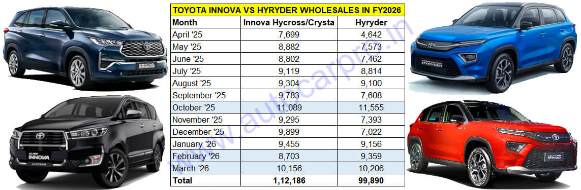 Nevertheless, despite the charge of the Hyryder, the Innova maintained its numero uno status in the Toyota India stable and kept its midsize SUV sibling at bay in FY2026. In FY2026, combined Innova Hycross and Crysta sales were 112,186 units, up 5% YoY (FY2025: 107,204 units) and 12,296 units ahead of the Hyryder.
