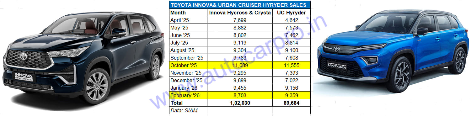 With 9,359 units in February, the Urban Cruiser Hyryder has outsold Toyota India’s longstanding best-seller, the Innova, for the second time in the current fiscal. If the popular midsize SUV sells 10,316 units in March, it will achieve the 100,000 milestone for the first time in FY2026.