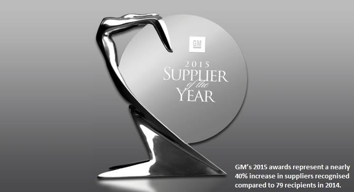 GM’s 2015 recognition represents a nearly 40 percent increase in the number of suppliers recognised compared to 79 recipients in 2014. More than half of the suppliers are repeat winners from 2014.