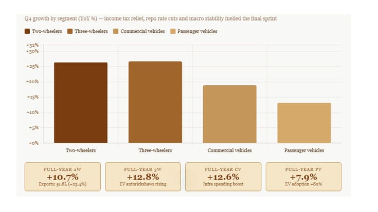 In Q4, all segments posted double-digit growth, with total domestic sales rising 23.6% year-on-year to 76.4 lakh units. Two-wheelers and three-wheelers led the growth, rising 26.4% and 26.7% respectively, while commercial vehicles grew 18.9% and passenger vehicles 13.2%.