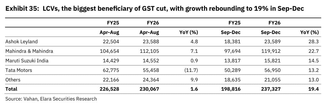 The LCV segment has emerged as the biggest winner from GST 2.0, according to Elara Capital. Volumes surged to 19% year-on-year in September-December, from just 1.6% in April-August.