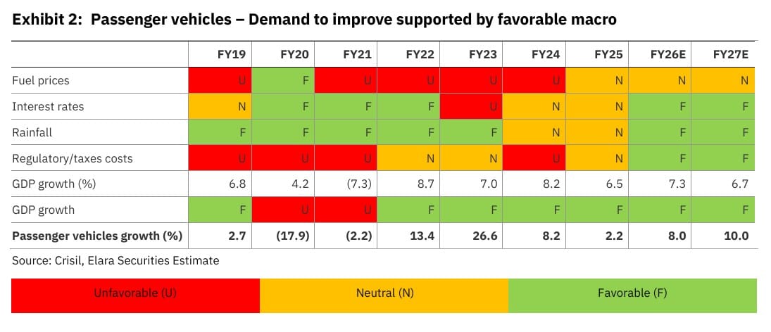 For passenger vehicles, Elara Capital raised its FY26 growth estimate to 8%, with growth expected to accelerate further to 10% in FY27 before moderating to 6% in FY28.