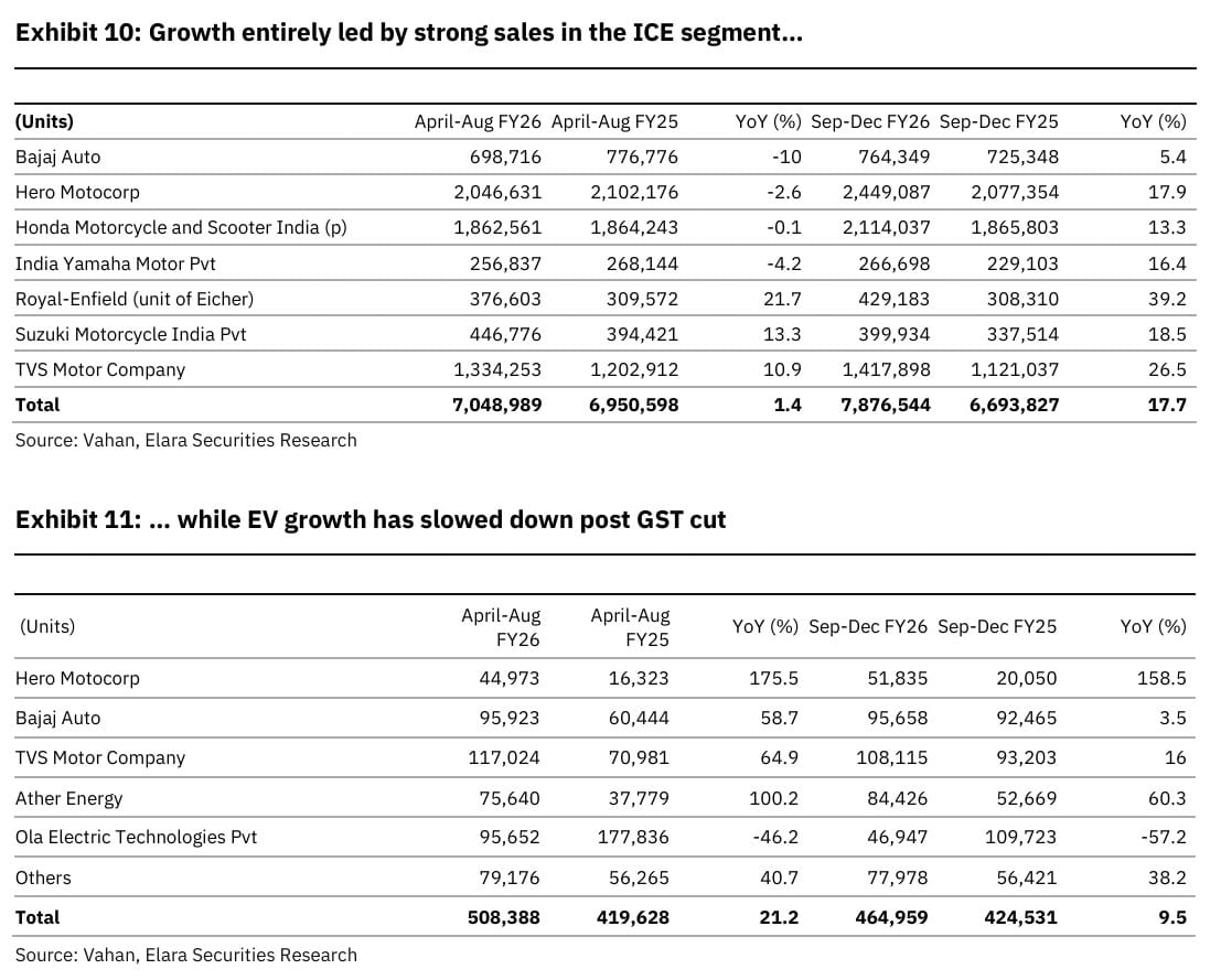 The two-wheeler volume growth rebounded sharply to 17% year-on-year in September-December 2025, compared with just 2.5% during April-August. The recovery has been driven almost entirely by ICE models, which grew around 18% post GST 2.0 compared with just 2.5% growth in April-August, while EV growth slowed to 9.5% from 21% earlier.