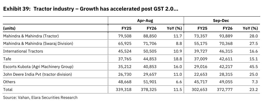 Elara Capital raised its FY26 tractor growth forecast to 19%, citing strong monsoons, improving farm incomes, supportive government policies and GST-led price relief.