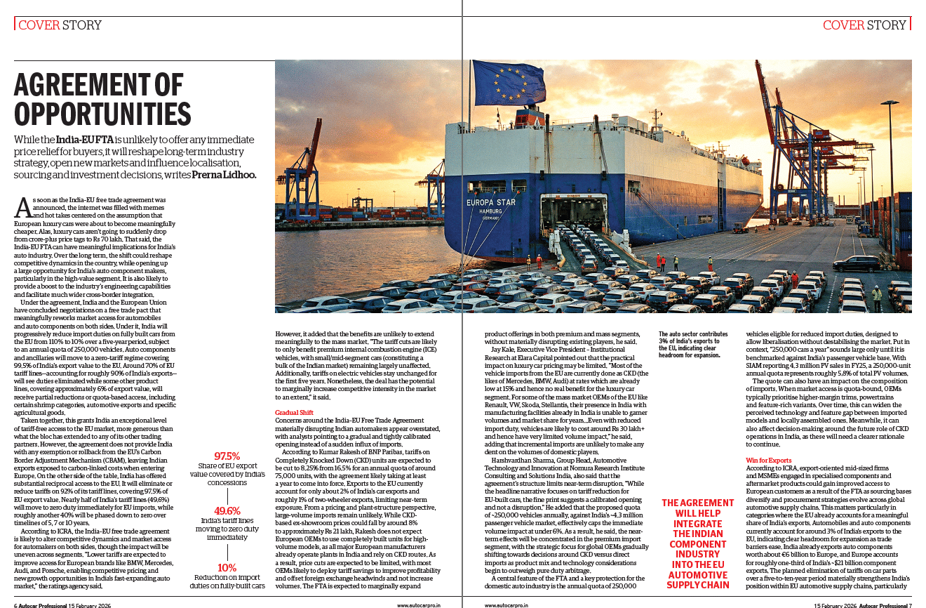 This edition of Autocar Professional examines the India–EU Free Trade Agreement as a long-term strategic framework rather than a short-term trigger for price corrections or import surges. The latest edition argues that the agreement, shaped by over fifteen years of negotiations, reflects a shared intent between India and the European Union to deepen trade and investment ties at a time when global supply chains are being reconfigured by geopolitical pressures.